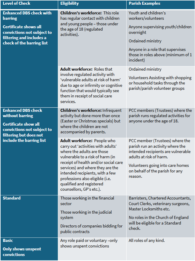 The PCC and incumbent are responsible for ensuring that all paid or volunteer workers with children, young people, and vulnerable adults at risk are safely recruited, trained, supported, and supervised. DBS checks, where a role is eligible, form one part of this safer recruitment process.